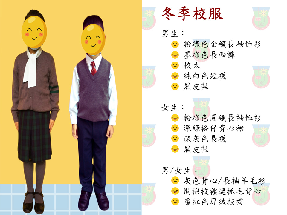 - 若溫度在12℃或以下,女生可穿運動服;全體學生可外加紅色或綠色禦寒大衣。