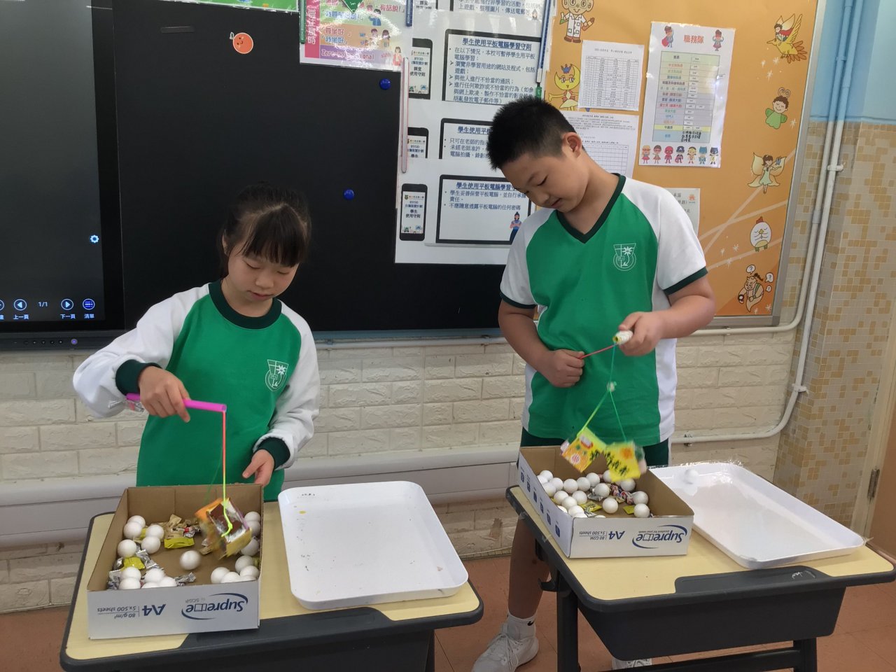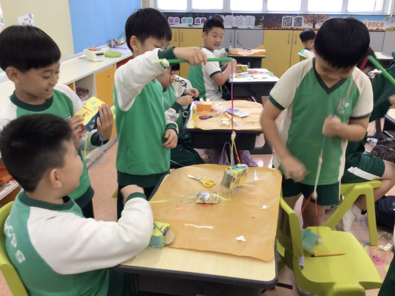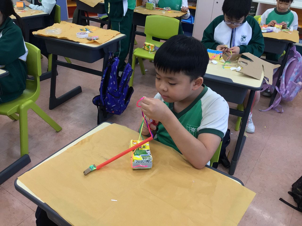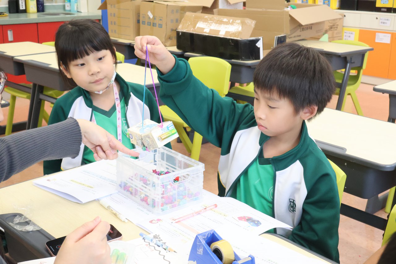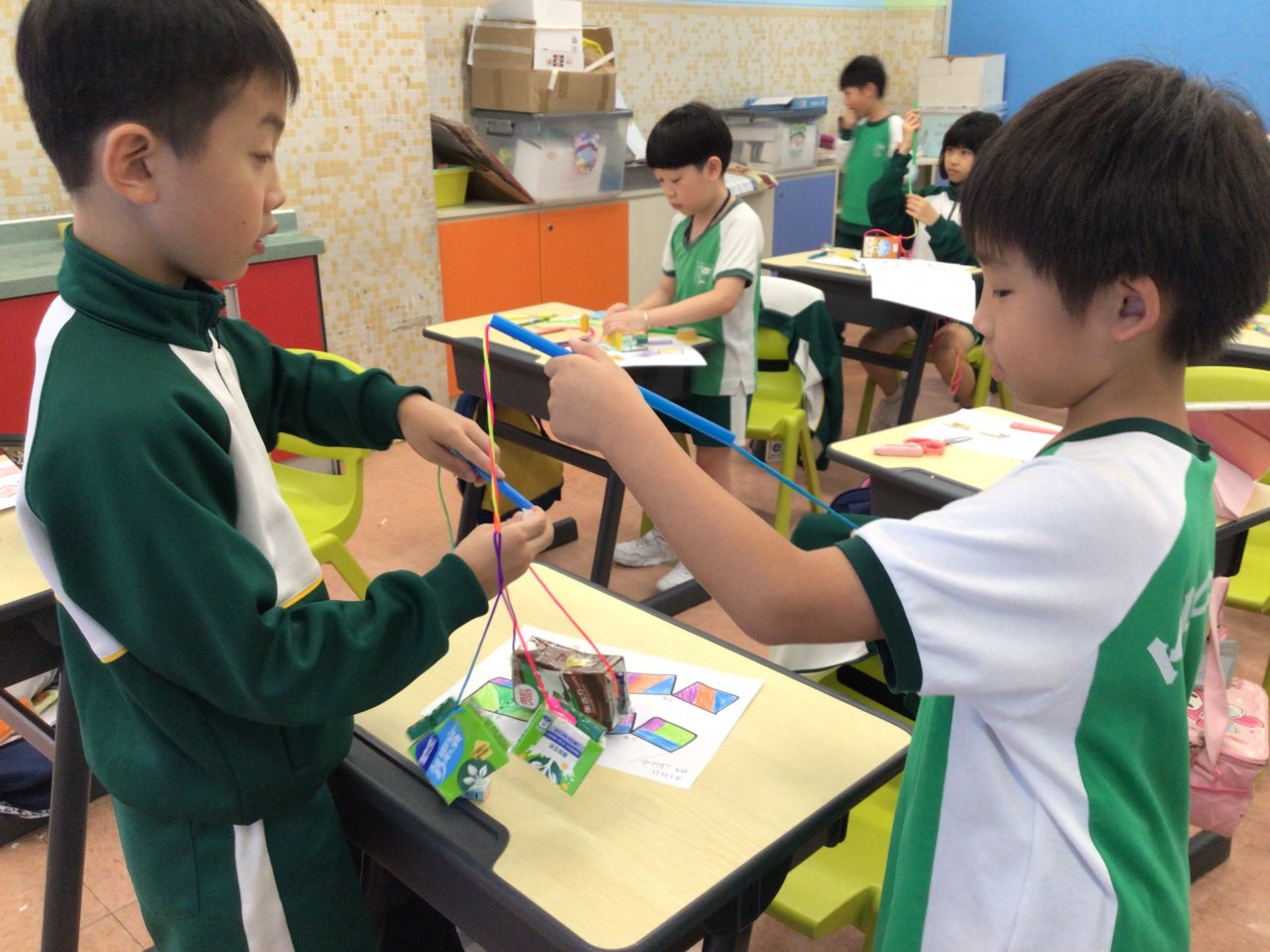 三年級同學運用簡單物料自製夾公仔機,利用機械運作原理控制夾子的開合,在公仔機上設計精美的圖案。經過多次改良,在第三天STEAM DAY,同學們進行了刺激的夾公仔比賽,以夾到最多物品者為勝。在過程中,同學們充分展現了創造力、解難和協作能力。