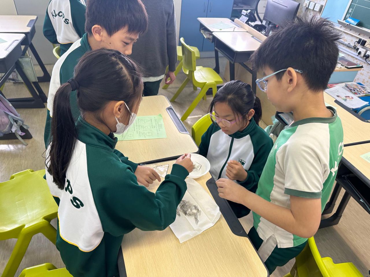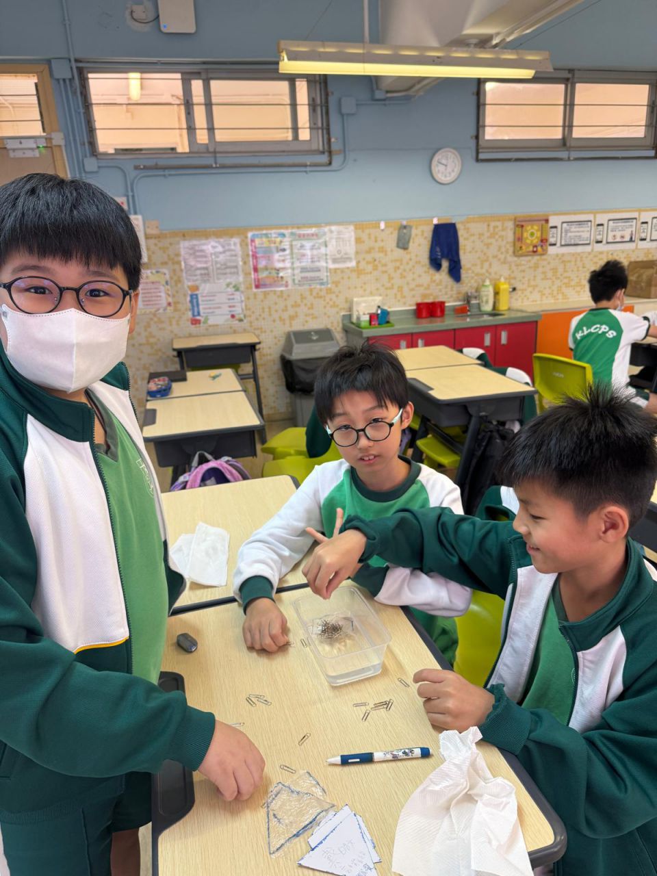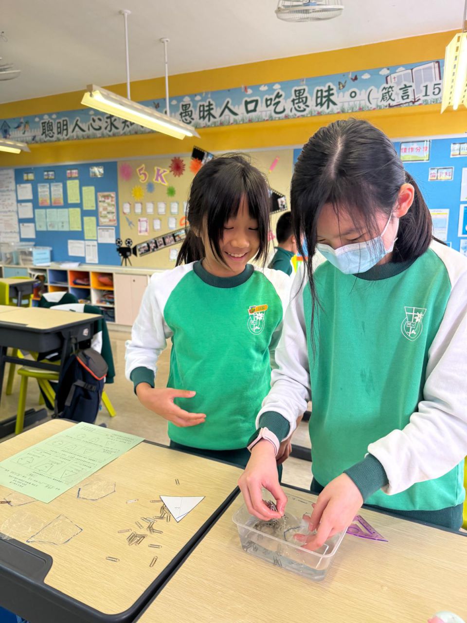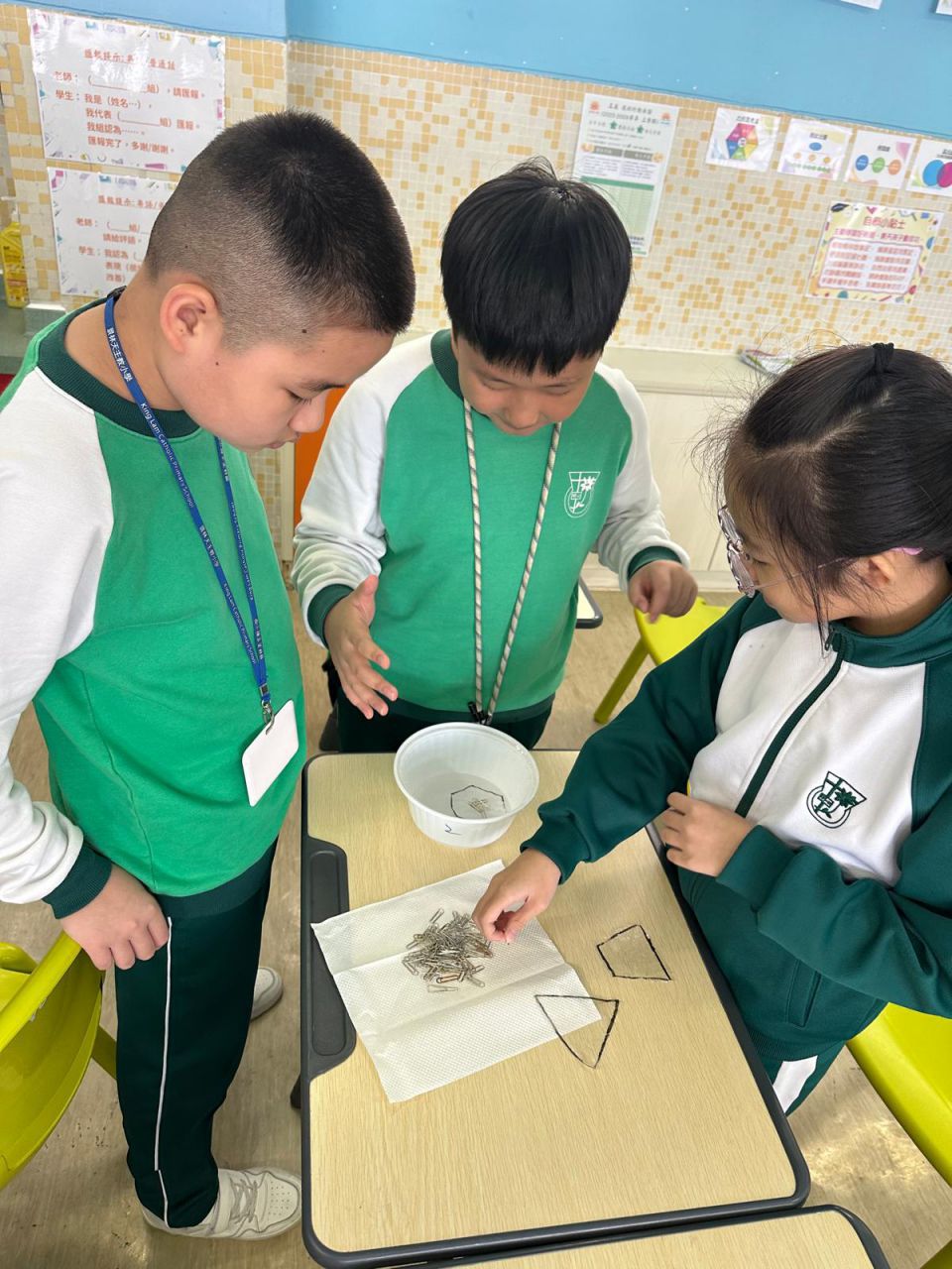 我們在 HAPPY HOUR 時段進行了認識數學科探究活動,五年級同學運用數學課堂所學的多邊形面積概念,用三個形狀不一、面積相同的多邊形製作小貨船。他們測試各個小貨船能承載多少個萬字夾而不下沉。 結果是出乎大家意料之外!即使貨船面積相同,放置萬字夾的位置和力度也會影響貨船承載量,原來貨船的形狀並非唯一影響浮沉的因素。