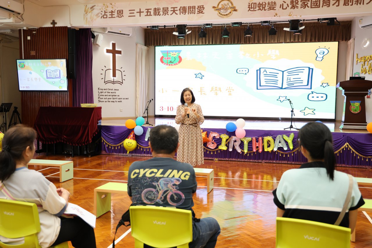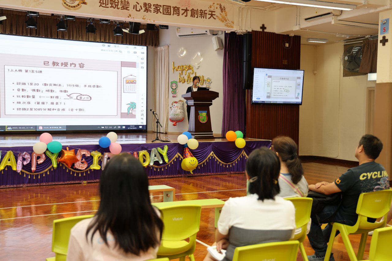 本校於10月3日舉行了「小一家長學堂」,由中、英、數、人文及科學科老師向家長講述各科課程重點及自主學習資源,讓家長更能掌握協助子女温習的方法,為第一次進展性評估作最佳準備。當天出席的家長對活動反應正面,認為「小一家長學堂」能協助家長理解學校課程及支援學生學習。