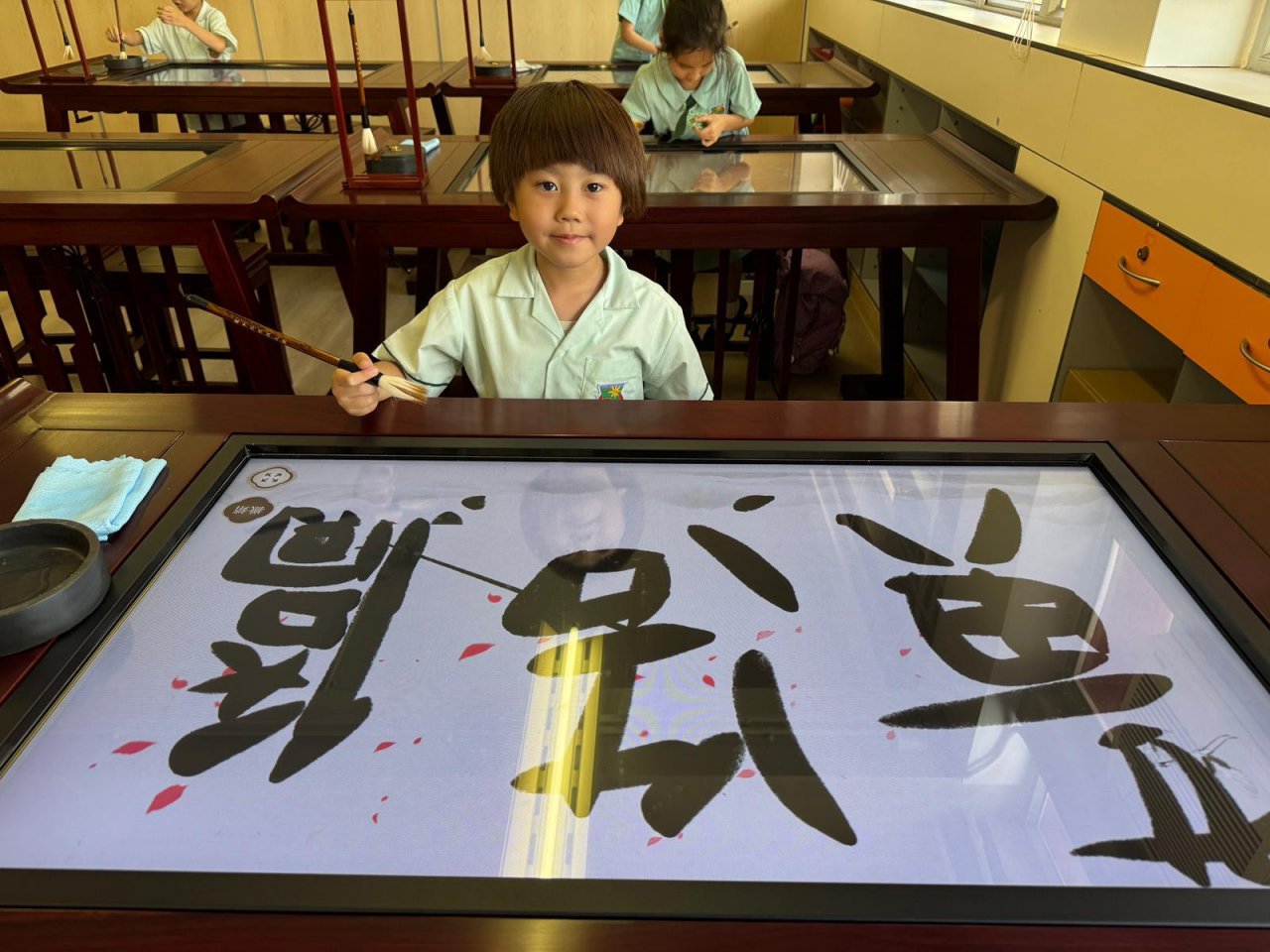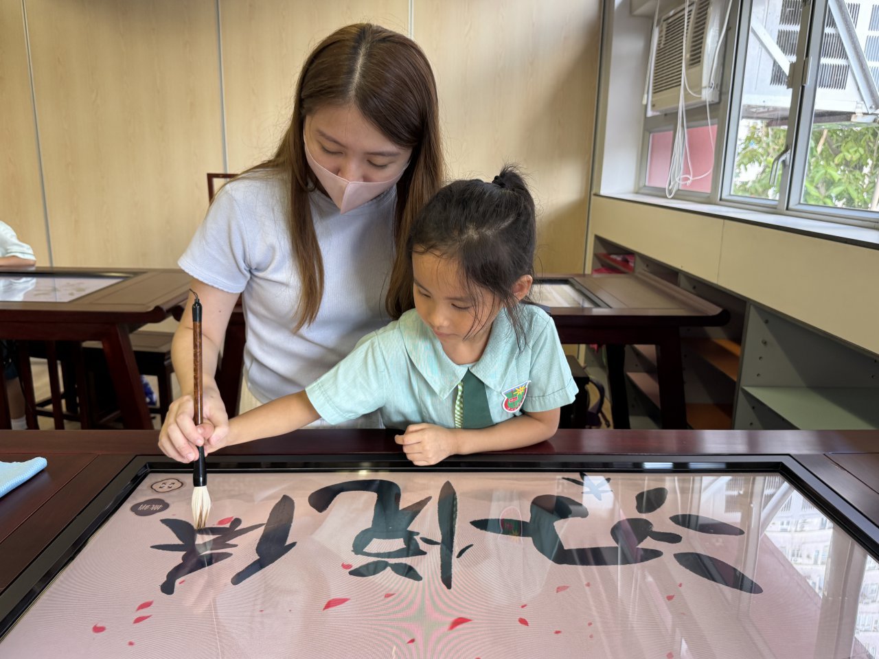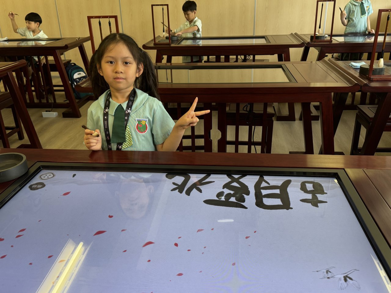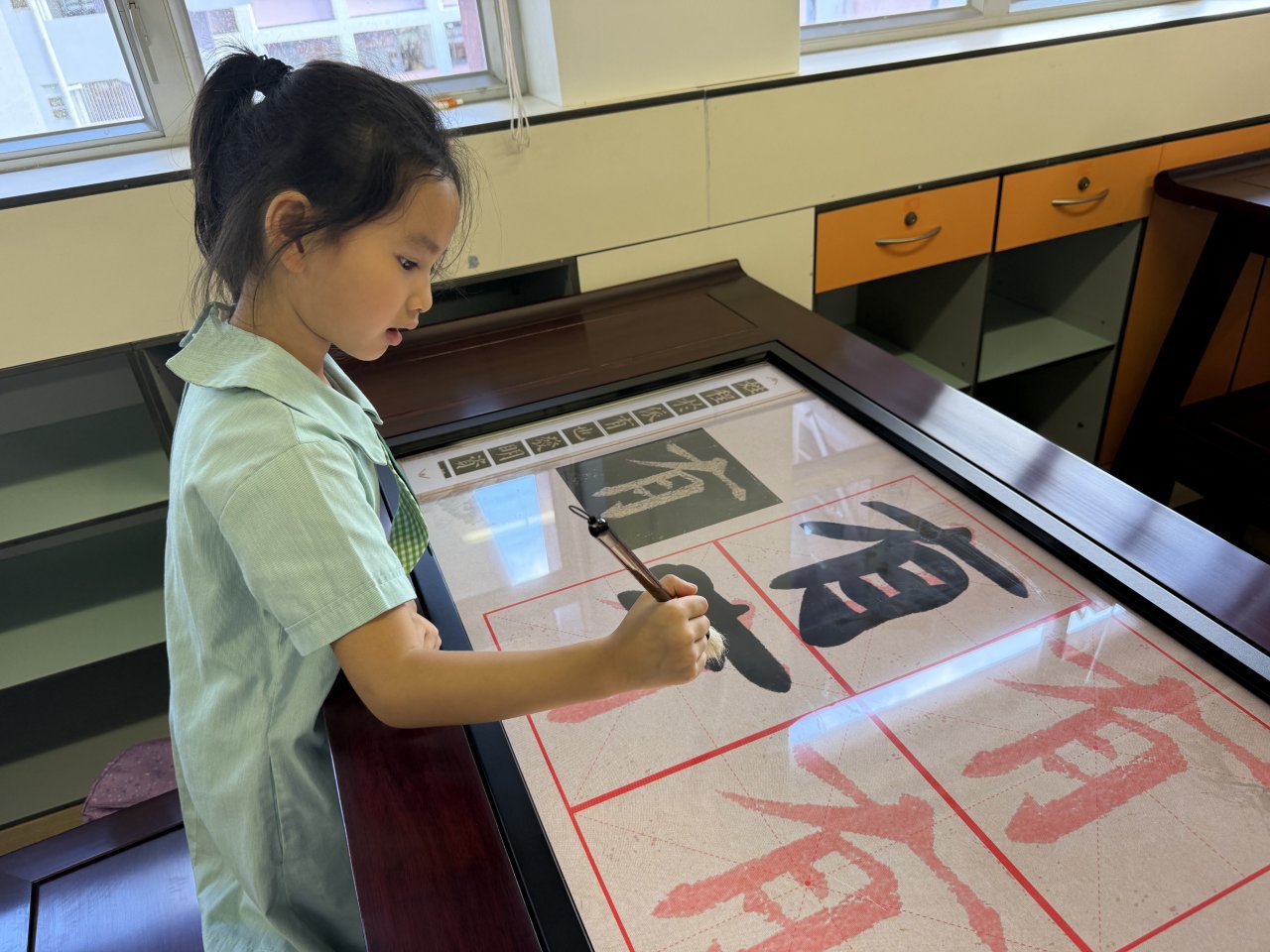 小一學生到本校中華文化室(雅軒)參加電子書法桌活動,他們專心致志地練習書法,體會書法的美妙與樂趣。