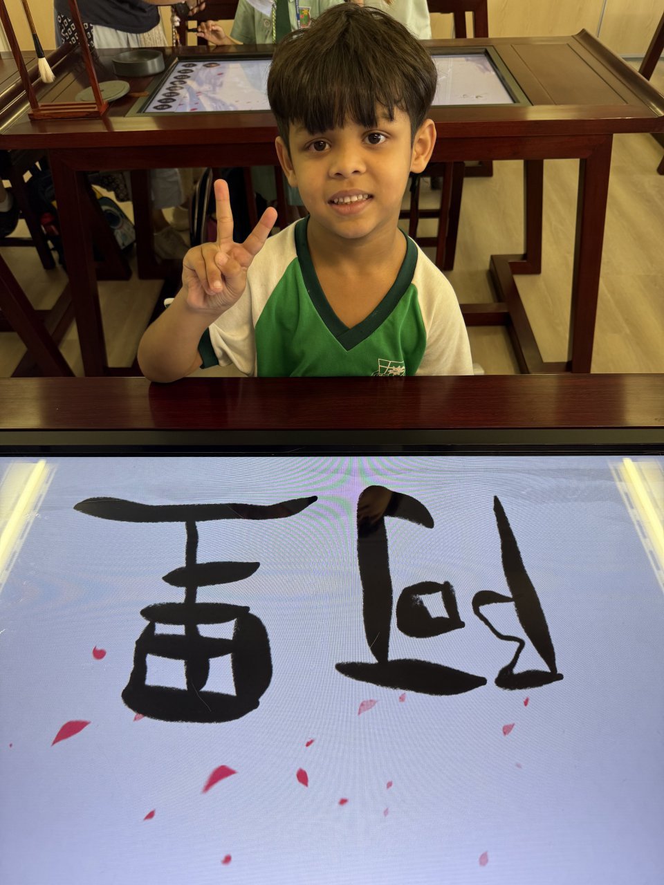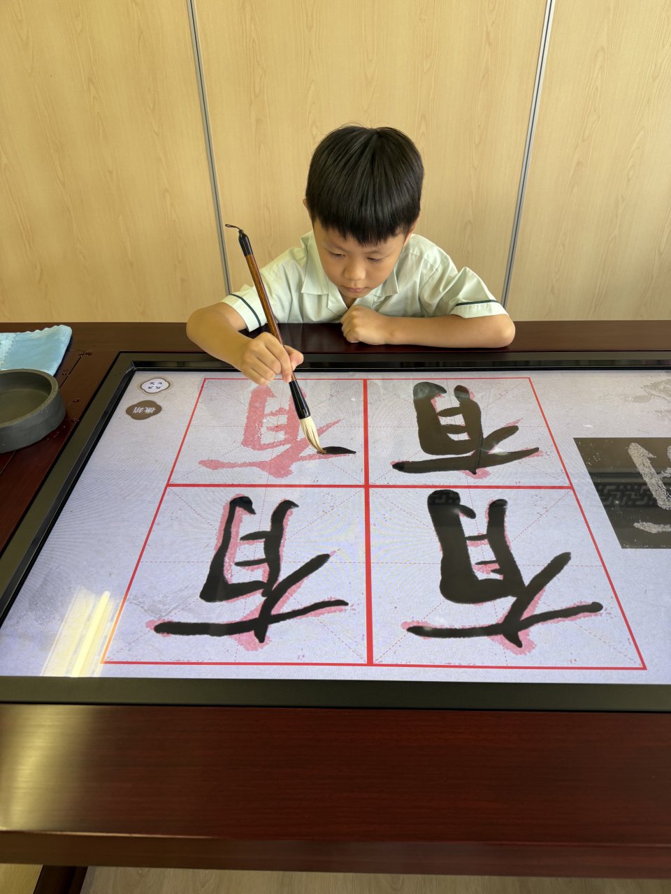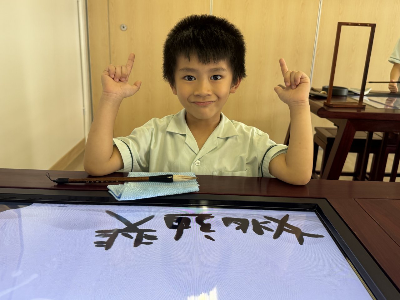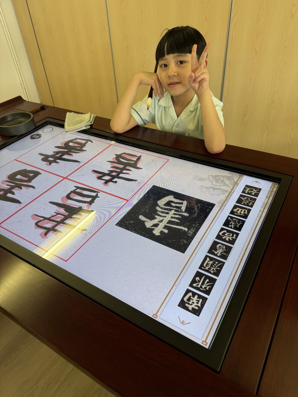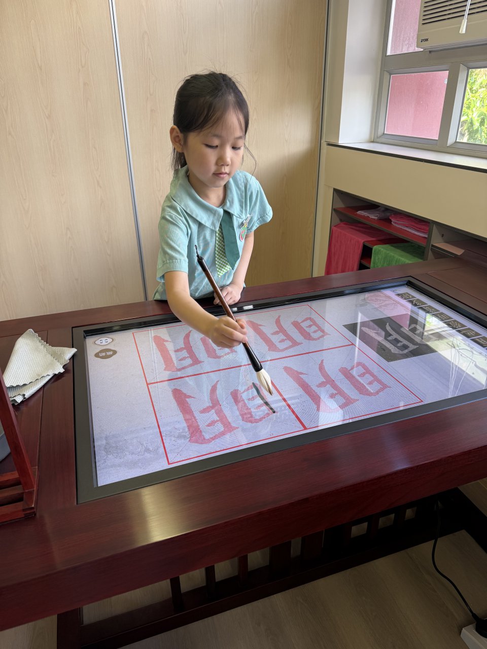 小一學生到本校中華文化室(雅軒)參加電子書法桌活動,他們專心致志地練習書法,體會書法的美妙與樂趣。