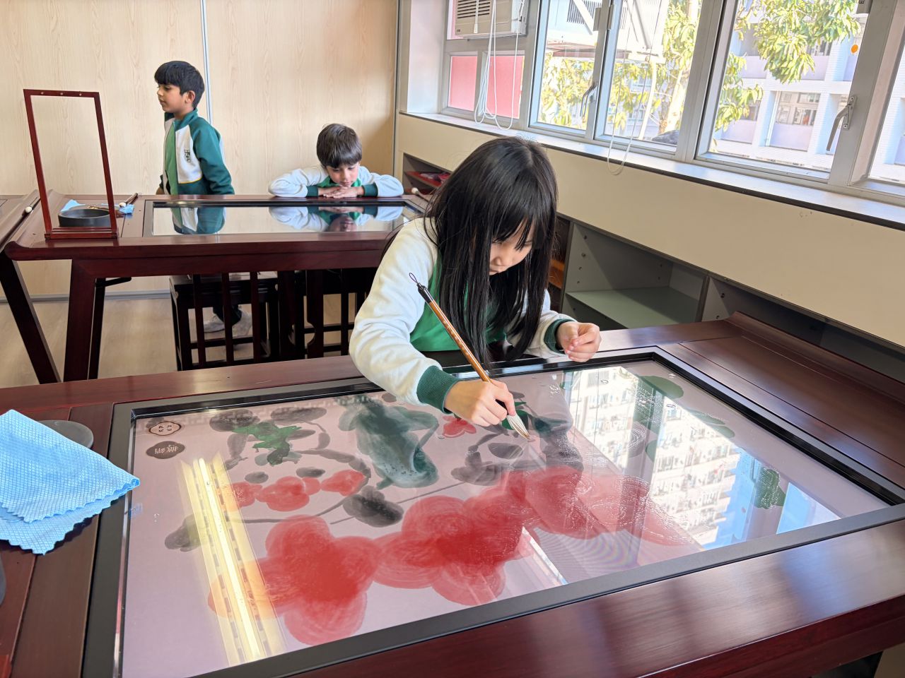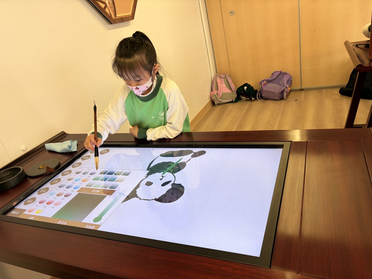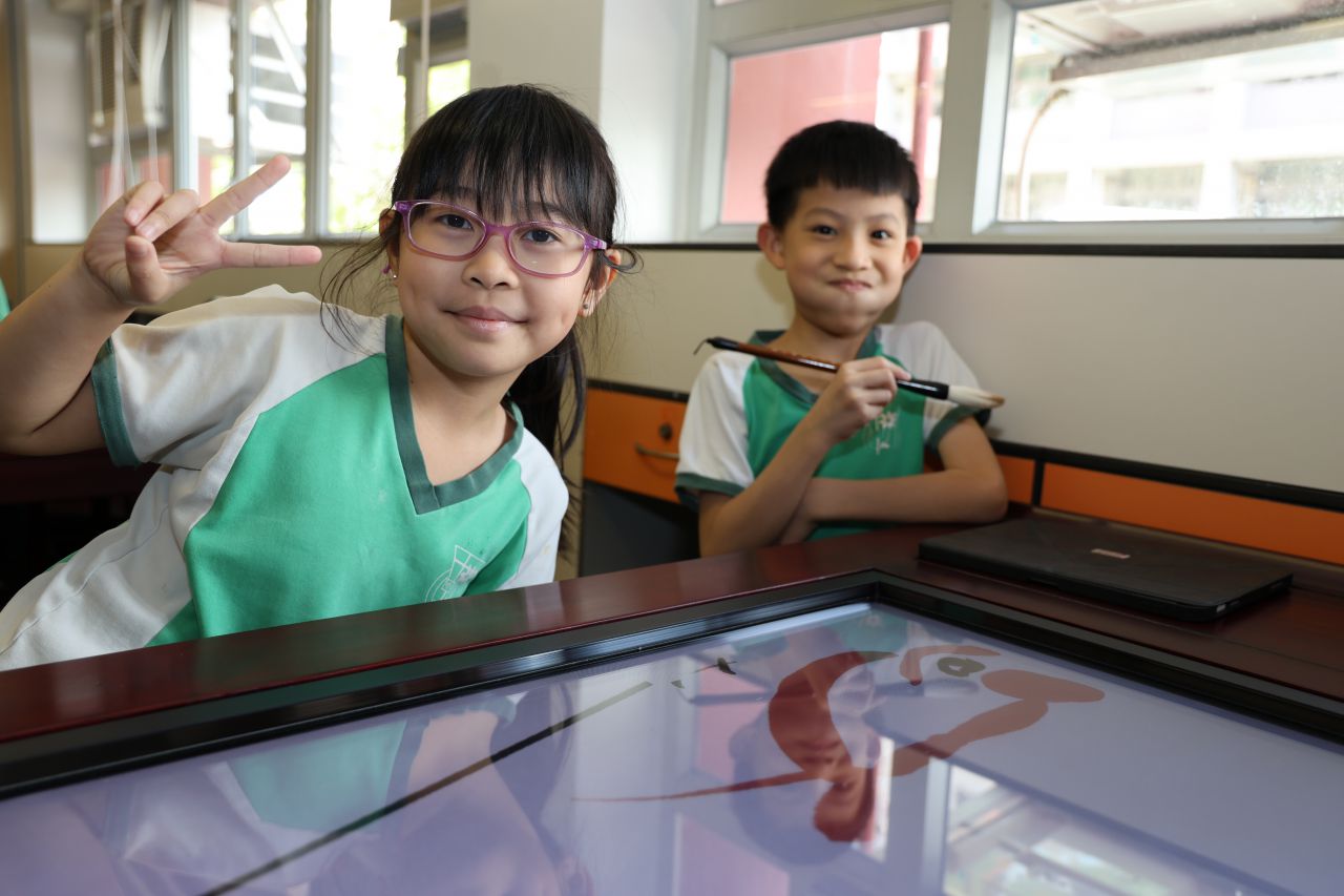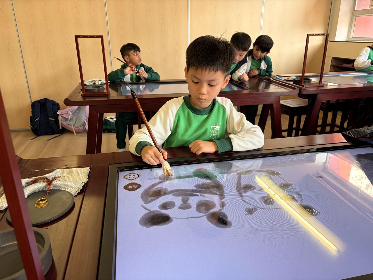 二、四、六年級學生使用書法桌欣賞水墨作品的細節,並使用毛筆在書法桌上繪畫熊貓、鯉魚和荷花。