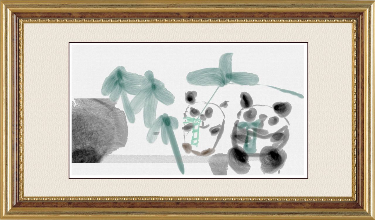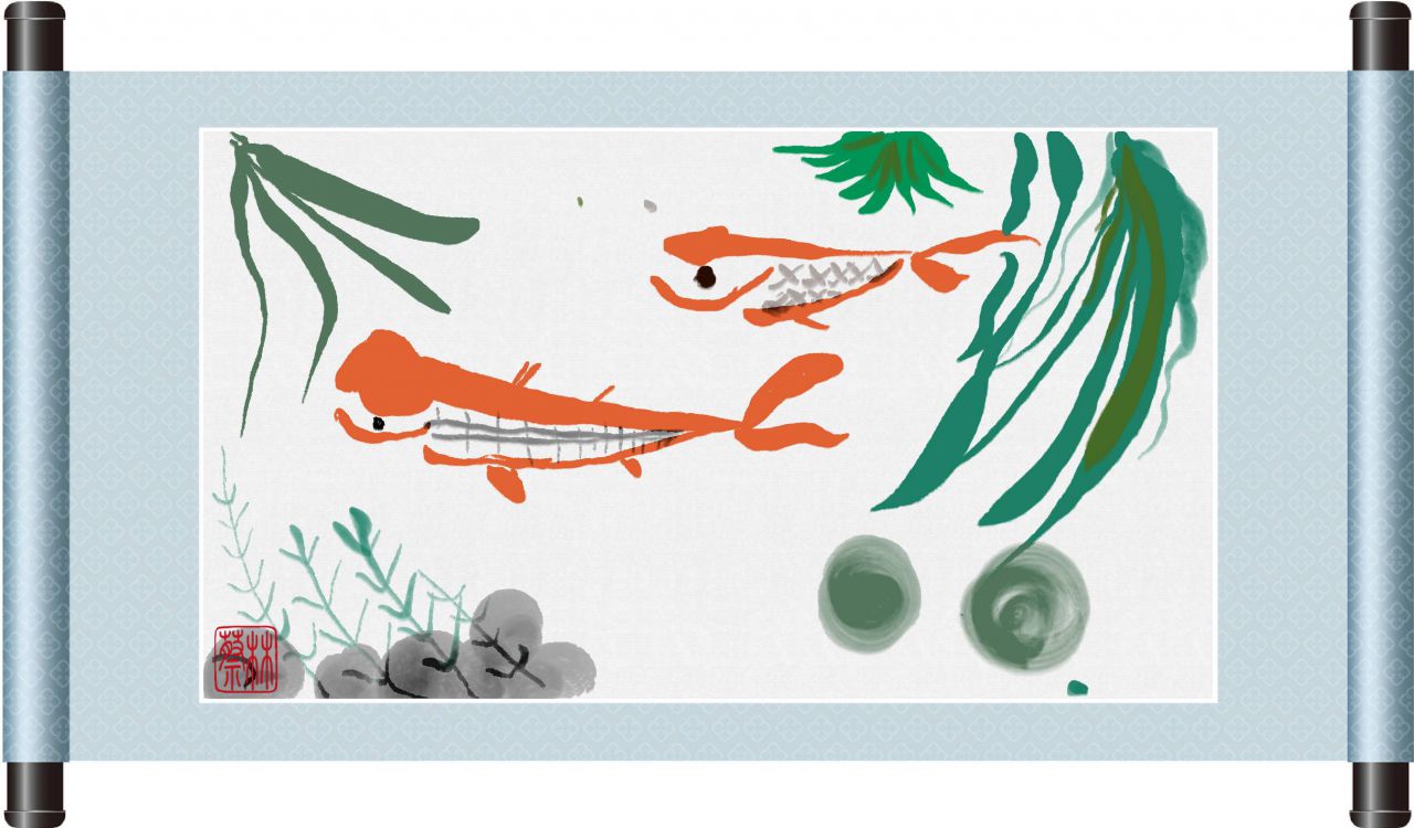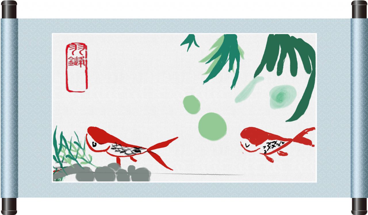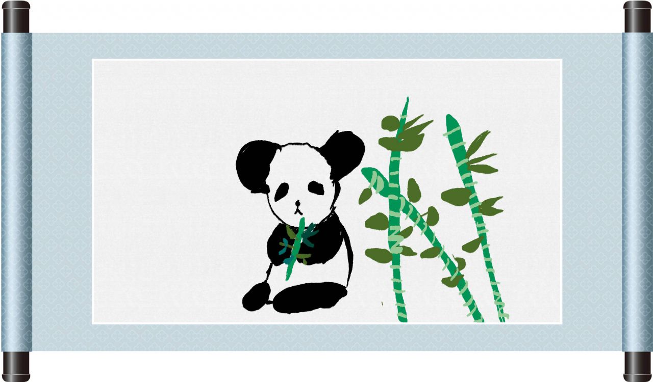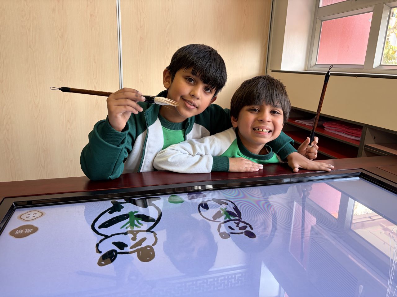 二、四、六年級學生使用書法桌欣賞水墨作品的細節,並使用毛筆在書法桌上繪畫熊貓、鯉魚和荷花。