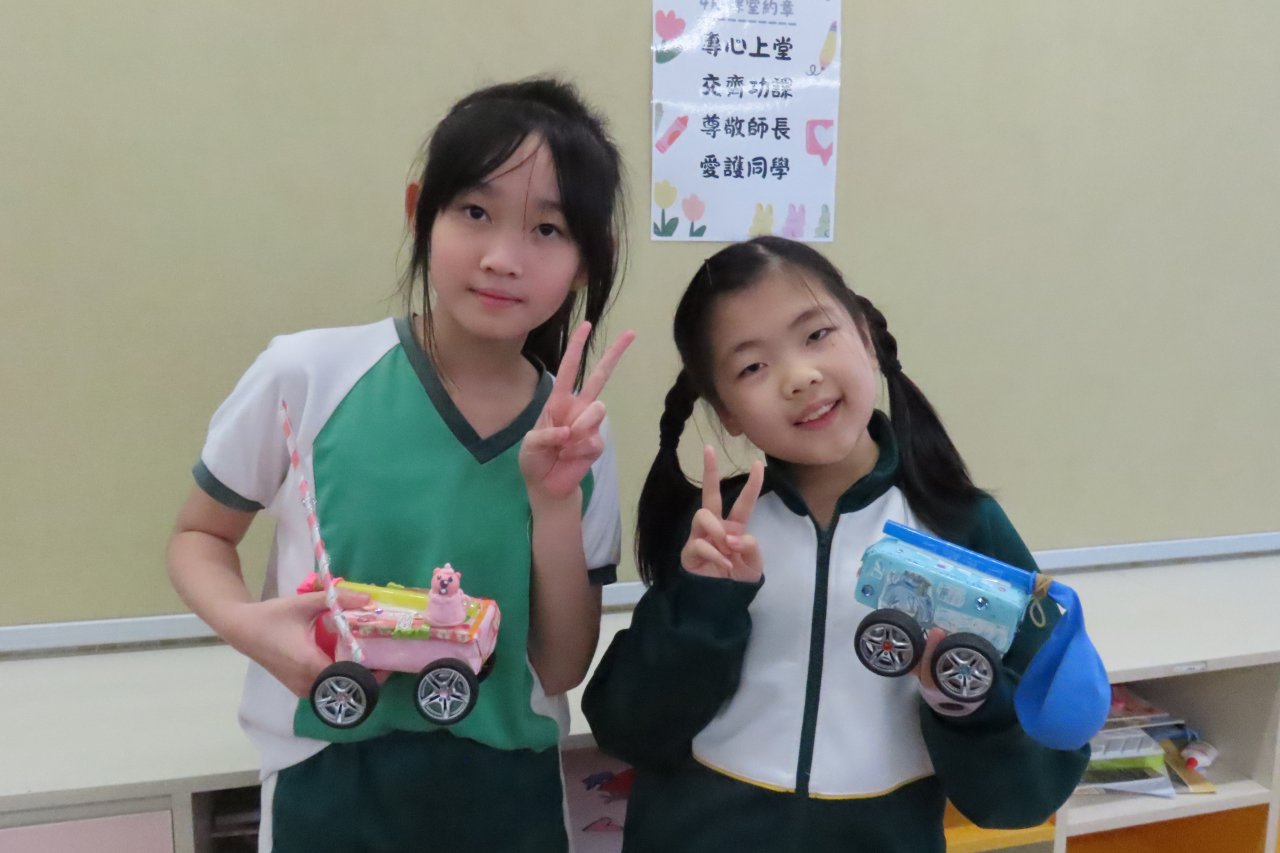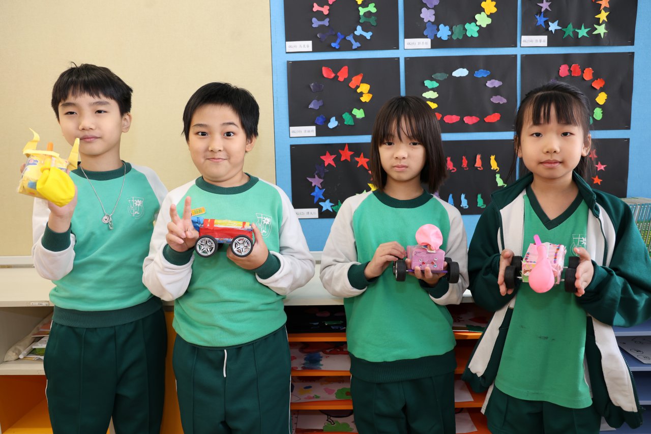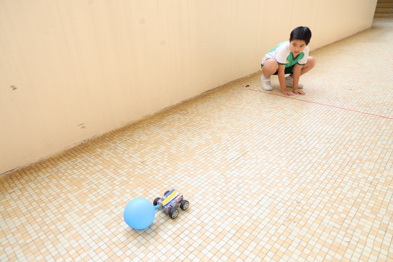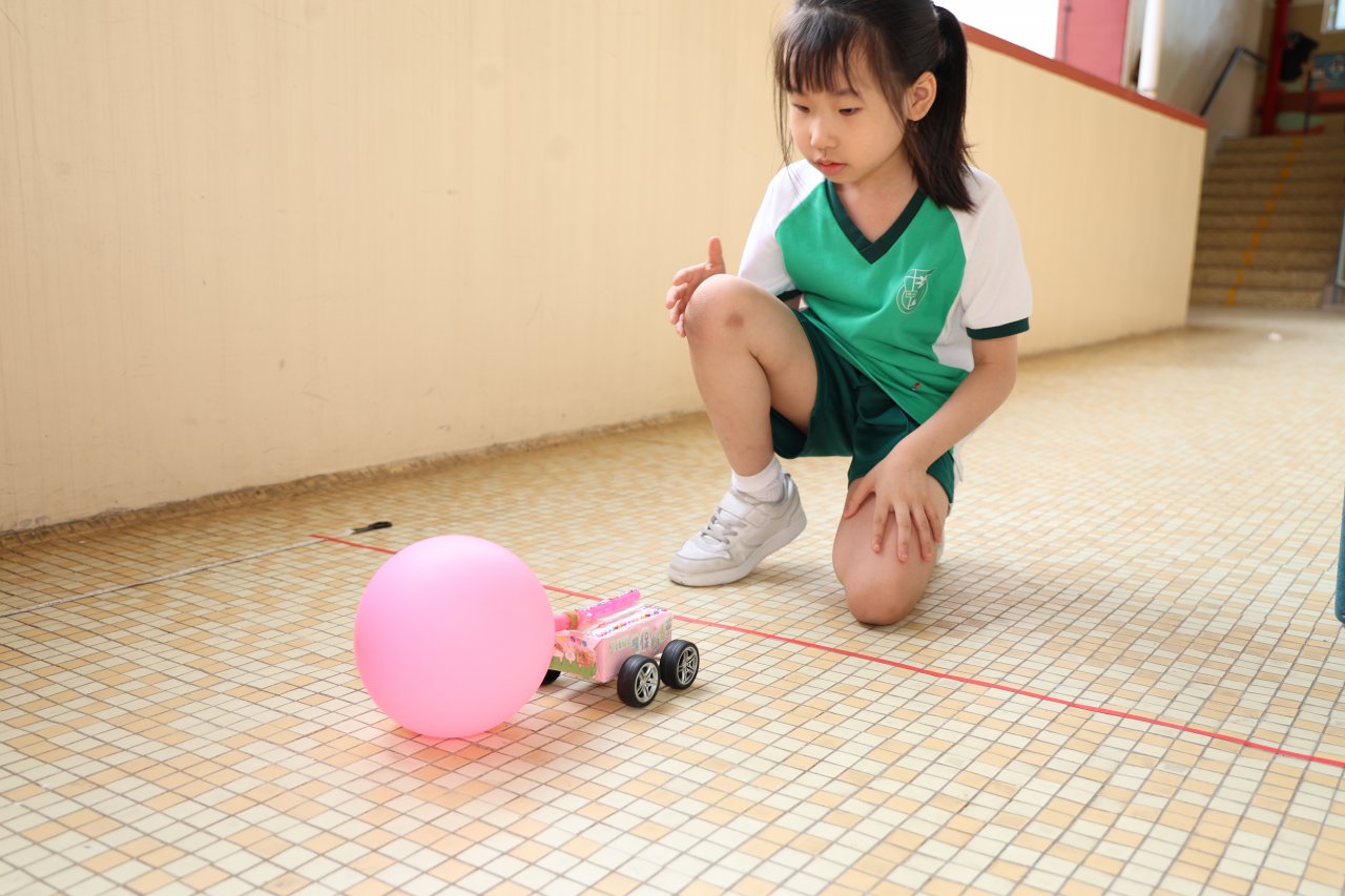 四年級同學生於 STEAM DAY 了解更多的交通工具所造成的空氣污染問題,並利用紙包飲品盒、氣球、車輪、車軸和簡單的環保物料設計及製作了一輛環保動力車,當中學習作用力和反作用力的科學原理,並進行既緊張又刺激的班際比賽!同學都十分投入老師亦從同學中挑選最用心設計大獎及最具創意獎,鼓勵用心裝飾動力車的學生。