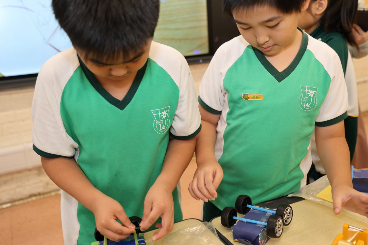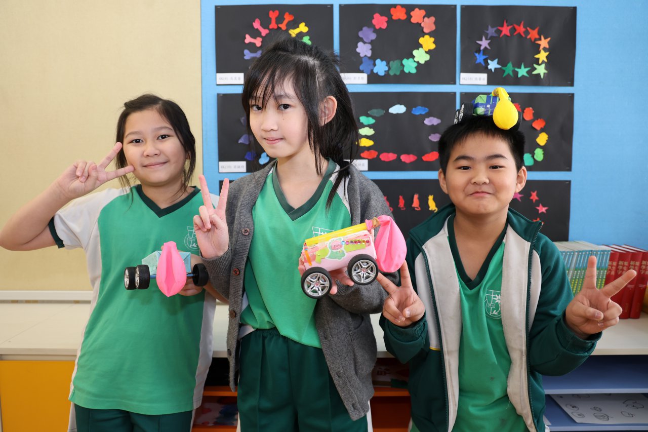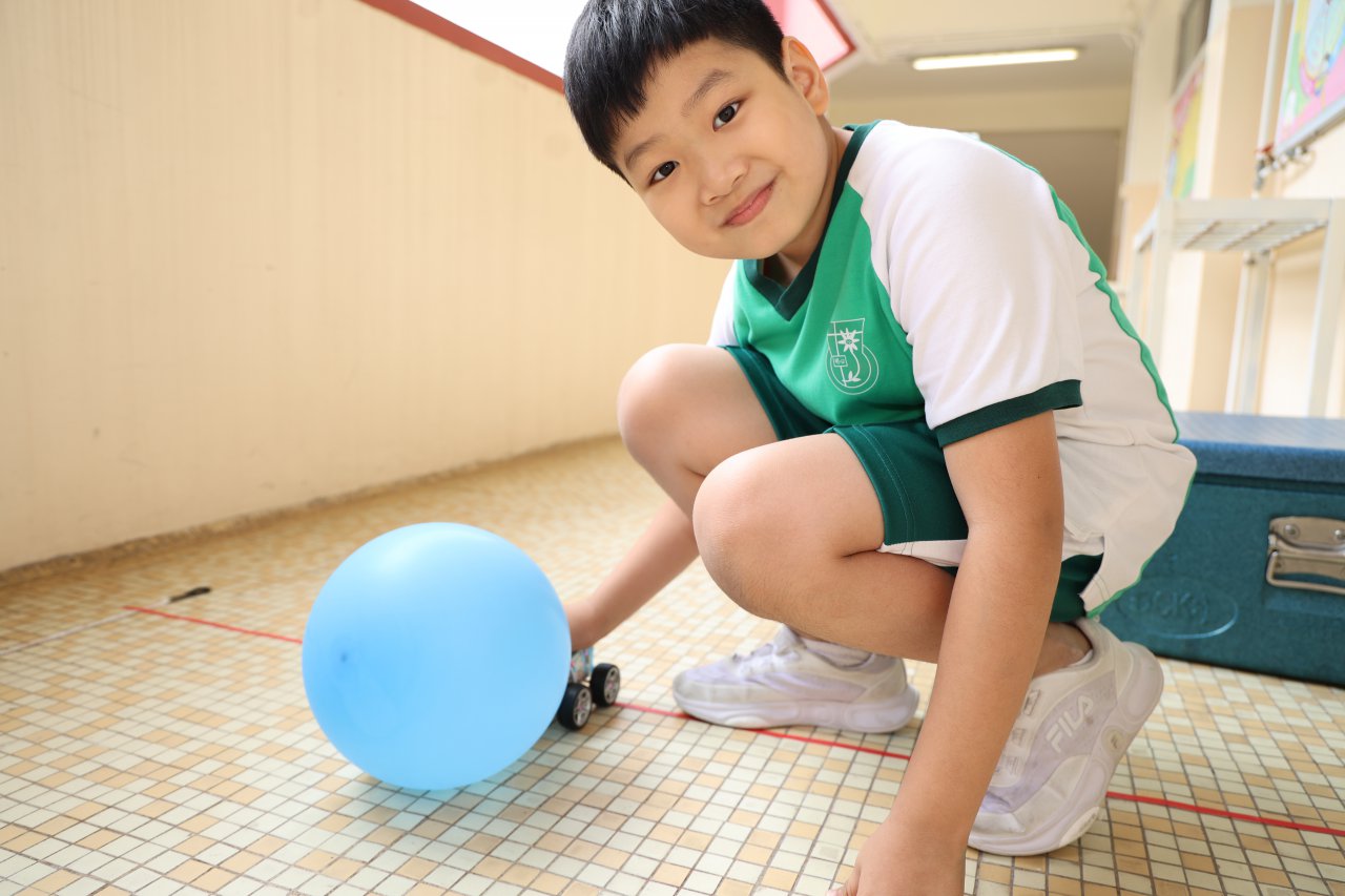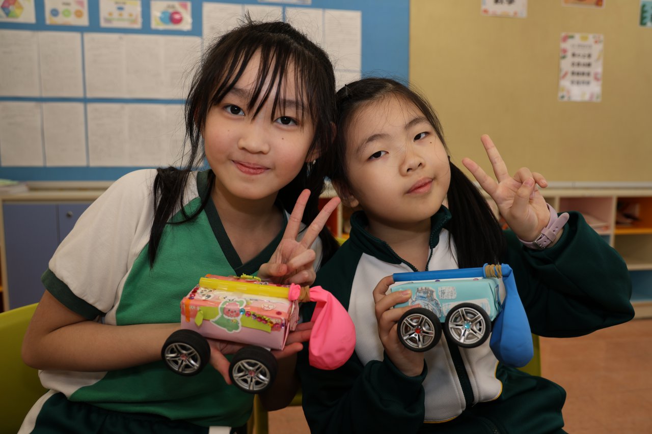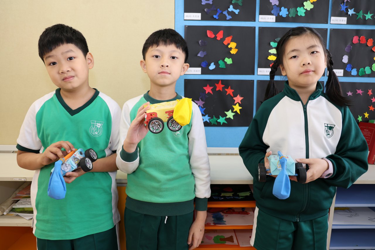 四年級同學生於 STEAM DAY 了解更多的交通工具所造成的空氣污染問題,並利用紙包飲品盒、氣球、車輪、車軸和簡單的環保物料設計及製作了一輛環保動力車,當中學習作用力和反作用力的科學原理,並進行既緊張又刺激的班際比賽!同學都十分投入老師亦從同學中挑選最用心設計大獎及最具創意獎,鼓勵用心裝飾動力車的學生。