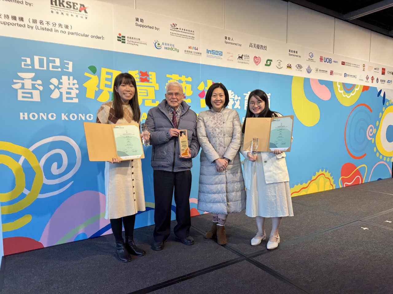 校長何詠懿、藝術科主任何嘉盈及蔡思慧於獲邀出席「香港視覺藝術教育節2023」頒獎禮。評審讚揚老師富教學熱誠,重視創作力,以視覺藝術為主導,引入元宇宙,嘗試啟發學生設計思維,並把實體連繫虛擬世界,設立元宇宙藝術展覽,籍此讓學生透過學習科技及美術知識,推動學校STEAM教育。