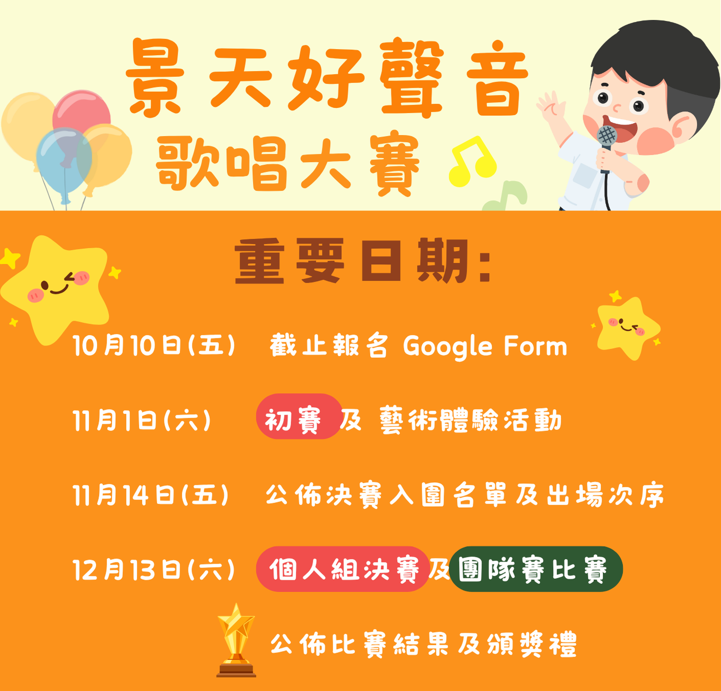目的 : 透過填色比賽,讓小朋友從創作中發揮創造力和藝術天分 物料: 填色顏料不限,可使用環保物料作拼貼。 參賽資格: 西貢區幼稚園學生 評分準則: 切合主題、創意展現及色彩配搭 參賽辦法: 請參賽學生於 10 月 31 日(星期二)前填妥表格,把作品遞交所屬幼 稚園、郵寄或親自交回本校。 獎項: 比賽設冠、亞、季軍; 「最具創意大獎」、「最具心思大獎」、「最具藝術家潛能大獎」、「Facebook最受歡迎大獎」及「最踴躍學校參與大獎」 。 公佈結果: 1. 比賽結果將於11月20日(星期一)於本校網頁及Facebook專頁公佈。所有得獎作品將入圍競逐「Facebook最受歡迎大獎」,並進行網上公開投票。獲得最多票數的作品將獲得此獎項 。 2. 頒獎禮於12月2日舉行,校方將通知獲獎同學。得獎作品將於4月本校視藝展中展出。請填寫正確聯絡方法及學生資料。 將於2024年4月於本校禮堂舉行,屆時請密切留意本校網頁「幼小銜接活動資訊」 。 主題視覺藝術展: