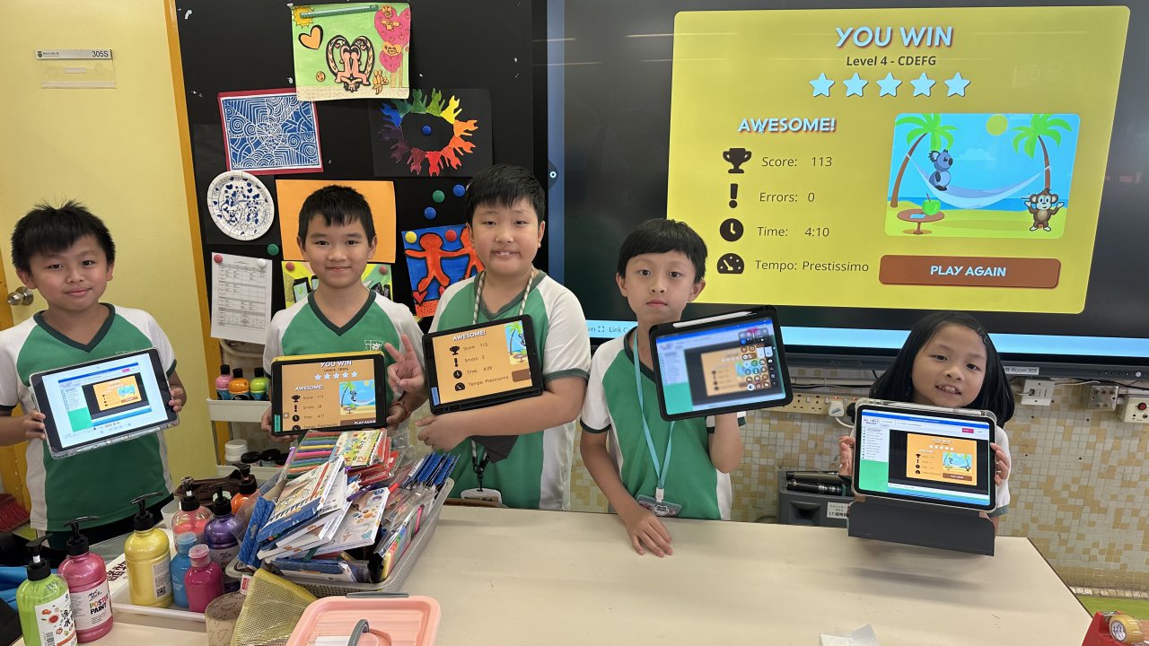 在五線譜遊戲裡,學生們透過 Musicplay Online 的遊戲,了解五線譜上的音高(或稱音符),並爭取達到更高的得分。