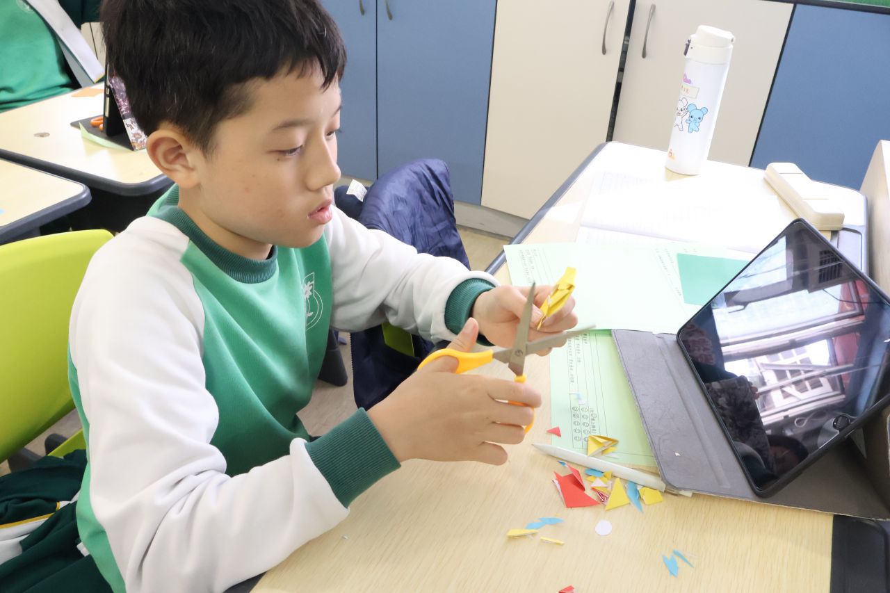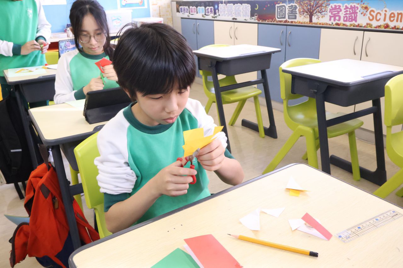 配合數學小六平面對稱的課程,同學們於happy hour時段學習利用手工紙對摺疊形成對稱軸,然後跟據同學們的創意,剪成不同款式的對稱圖形。